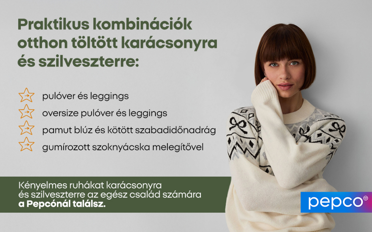 A karácsony és a szilveszter otthon töltésének sok varázsa van. Ez lehetővé teszi, hogy szabadon érezd magad, pihenj és a szeretteiddel töltött értékes időre összpontosíts. A meghittség egy olyan mottó, amely elválaszthatatlanul összekapcsolódik az otthonossággal - még akkor is, ha az első csillagot várod, vagy az óév utolsó másodperceit számolod. Ha azt tervezed, hogy idén a saját otthonodban töltöd ezt a különleges időszakot, gondoskodj arról, hogy jól érezd magad. Gondoskodj a megfelelő ruházatról az anyuka és a baba számára - legyen kényelmes, de az alkalomhoz illő. Fedezd fel a Pepcónál elérhető javaslatokat!