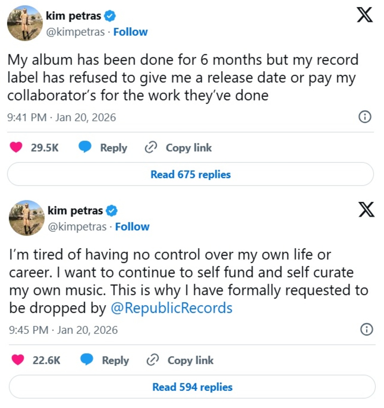 hirdetésKim Petrasnak elega van! Az énekesnő a Twitter utódjaként ismert X-en hozta nyilvánosságra, hogy minden vágya az, hogy szerződést bonthasson lemezkiadójával, a Republic Recordsszal, mert besokallt attól, hogy meg van kötve a keze