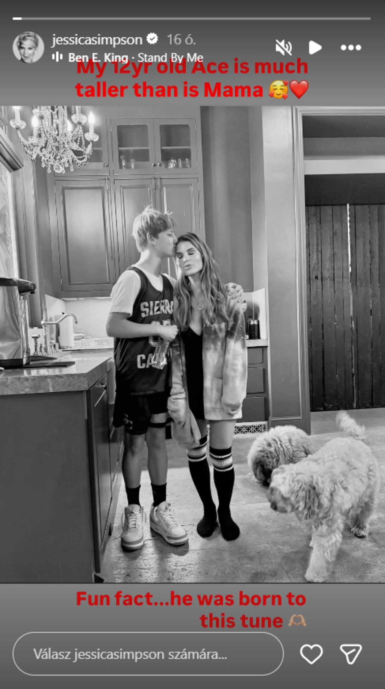 hirdetésJessica Simpson tegnap az Instagram Story részlegén tett közzé egy friss felvételt 12 éves fiáról, Ace-ről. A képen anya és fia egymás mellett állnak, a tinédzser pedig puszit ad édesanyja homlokára.