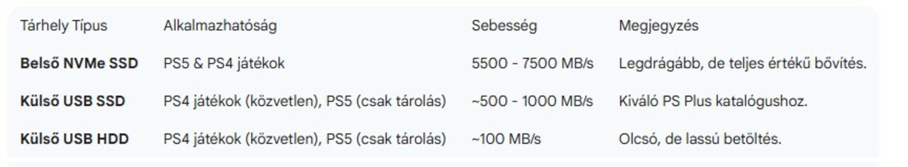 Bár a PS5 játékok csak a belső SSD-ről futtathatók, a visszafelé kompatibilis PS4 játékok (amelyekből több ezer érhető el) külső USB-s meghajtóról is indíthatók. A használtpiaci csomagokban gyakran találni 2-5 TB-os külső merevlemezeket. Fontos tudni, hogy 2026-ban a külső SSD-k (például Seagate vagy Samsung T-széria) sokkal népszerűbbek a HDD-knél a drasztikusan rövidebb betöltési idők miatt.