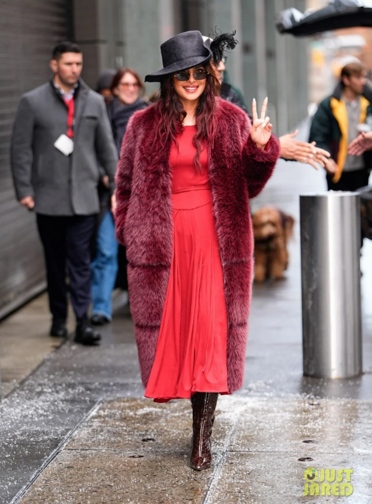 hirdetésA szikla című kalandfilm promóciós körútja jelenleg is tart – a film sztárja, Priyanka Chopra ennek apropóján érkezett tegnap a New York-i ABC Studioshoz. A színésznő azonnal magára vonta a figyelmet bohém, mégis elegáns megjelenésével: bordó szőrmekabátot viselt piros ruhával, tollal díszített kalappal, csizmával és napszemüveggel. Outfitje nagyban emlékeztetett kolléganője, Helena Bonham Carter klasszikus szereléseire.