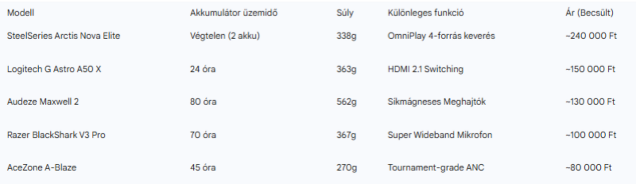 - Professzionális e-sport: Az AceZone A-Blaze vagy az Arctis Nova Elite ajánlott a minimális késleltetés és a maximális izoláció miatt.