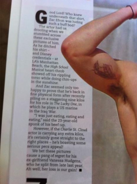 A 23 éves színész a közelmúltban jó pár tetoválásminta közül válogatott, és végül megtalálta az igazán ütős mintát. Így most már két toll jelképe látható a jobb karján. Az ábra gyönyörű lett, és Zac meg is mutatta új tetkóját, illetve tökéletesen kidolgozott felső testét az Ausztrál NW magazin márciusi számában.
