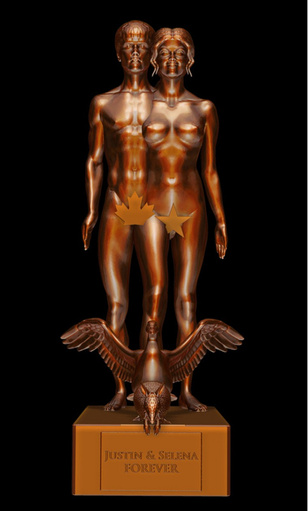 A 17 éves tinisztárt, Justin Biebert és 19 éves barátnőjét, Selena Gomezt bronzba öntötték, de nem is akárhogy! A párt meztelenül ábrázolják, intim testrészeiket pedig egy falevél és egy csillag takarja el.
