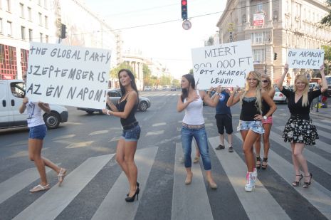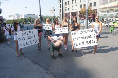 Táblákkal demonstráltak Budapest belvárosában magyar szépségek, hogy engedjék be őket a világ legnagyobb jótékonysági bulijára, a Global Partyra, amelyre 900 000 forint a belépő. A tüntetésnek egy szőrös hátsó felvillanása vetett véget.