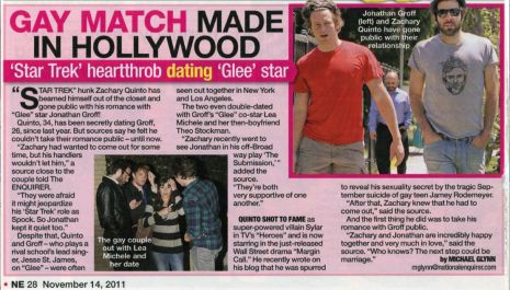 Több ezer lány szíve tört össze, amikor Zachary Quinto nyíltan felvállalta másságát a világ előtt. A női szíveknek itt az újabb hidegzuhany. Már lassan egy éve feltűnően sokszor kapták le együtt a lesifotósok a Heroes és a Star Trek sztárját és a Glee szépfiúját, Jonathan Groffot édes kettesben, de eddig csak barátságukra hivatkoztak, amikor kérdést szegeztek feléjük. A két színész azonban most felvállalta kapcsolatát, melyről egy közeli barát is nyilatkozott.