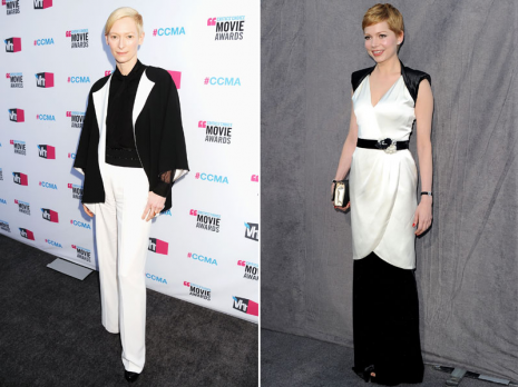 Persze olyan is adódott, aki ezt a két színt összekombinálta. Tilda Swinton egy különleges szabású kosztümöt viselt a díjátadó folyamán, és hiába nem vitte túlzásba öltözékét, mégis nagyon elegánsan festett. Michelle Williams egy Chanel-estélyit választott, azonban nem járt szerencsével. Olyan hatást keltett, mintha két ruhát vett volna egymásra, és a szörnyű szabás és a borzalmas virágos öv sem segített a helyzeten.