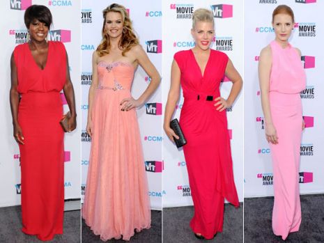 Azt est nagy színe volt a rózsaszín is, mely idén tavasszal ismét hódítani fog. Viola Davis a rózsaszín, narancssárgába hajló árnyalatát választotta, mely remekül állt neki, és a Raoul-ruha szabása is kíválóan takarta hátrányait, és emelte ki az előnyös testrészeit. Missi Pyle egy pánt nélküli, púder színű nagyestélyit viselt a vörösszőnyegen, ami tökéletesen passzolt világos bőréhez. A csillogó díszítés még különlegesebbé tette a ruhát, és megakadályzta, hogy Missi öltözéke esetleg átcsapjon a „túl egyszerű” kategóriába. Busy Philippsnek egy pink ruhára esett a választása, mely lágy szabása miatt még a merész szín ellenére is elegáns maradt, és remekül állt Busynek is. Jessica Chastain azonban mellélőtt ezzel a mályvaszínű estélyivel. Nagyon sápította az amúgy is világos bőrű színésznőt, és vörös hajával sem volt igazán összhangban. A szabása sem volt a legelőnyösebb, a bő felsőrész erősítette a színésznőt, csak úgy, mint a vastag derékrész.