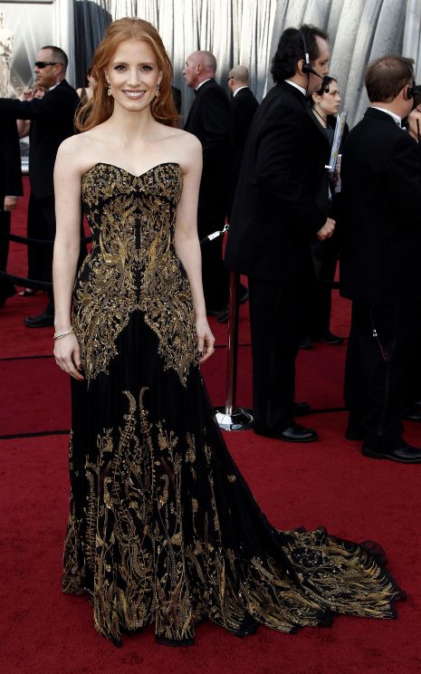 Az Oscar fekete, arany és e két szín keveréke nélkül sosem múlik el. Angelina Jolie egy, a mellén aszimetrikusan szabott, bársony Atelier Versace-darabban forrósította fel a hangulatot maga körül. Ezt a fantasztikusan sikerült bevonulást csak a 62 éves Meryl Streep megjelenése tudta méltóképp megkoronázni. Az est női nyertese egy lenyügöző, arany színű Lanvin-ruhában vette át jól megérdemelt díját. Jessica Chastain, a The Help egyik főszereplőnője egy vállnélküli Alexander McQueen-darabban pózolt a kamerák előtt. Estélyijéhez csak egy szolid karkötőt „hívott segítségül”.