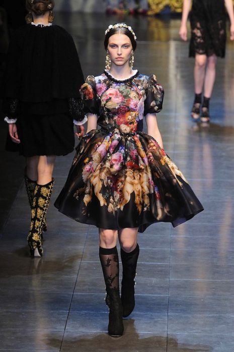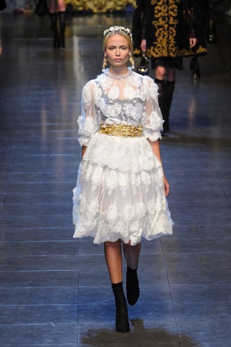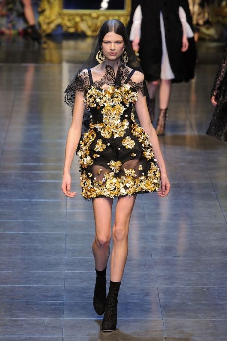 Domenico Dolce és Stefano Gabbana legújabb kollekcióját a szicíliai műtárgyak ihlették, éppen ezért modelljeik szebbnél szebb, csillogó ékszerekkel tarkítva léptek a kifutóra. Barokk hatást idéző darabjaikon megfigyelhető a szűzies csipke, a fekete fátyol, de jellemzőek az arany hímzéses kabátok és szoktyák, valamint a szokásos, virágmintás együttesek is. Kiegészítőiknél a gyöngyök és az aranyszín a meghatározó.
