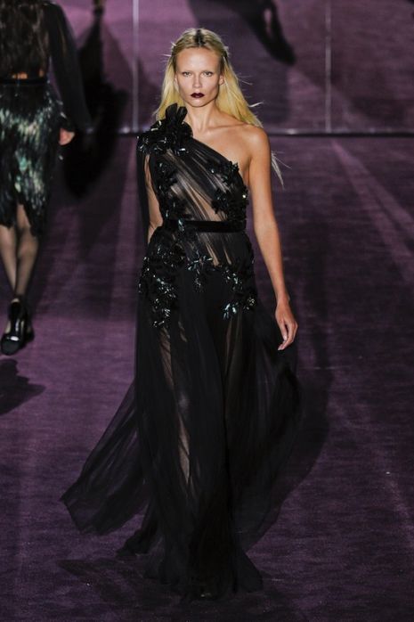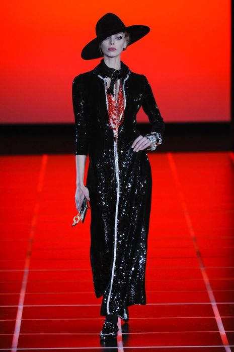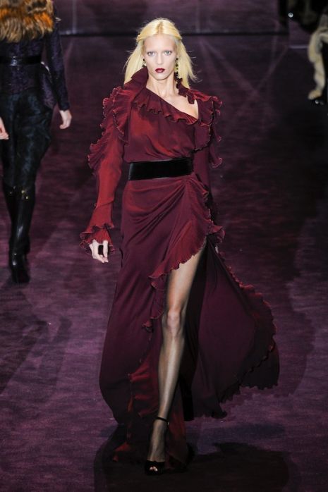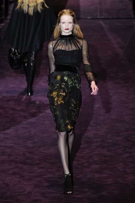 Frida Giannini modelljei selyemből, bőrből és bársonyból készült sötét színű – leggyakrabban fekete, lila, smaragd és bordó –, virágmintákkal, fodrokkal díszített ruhákat viseltek a 19. századi, komor világot idéző divatbemutatón, ahol többek között katonai dzsekikre emlékeztető kabátok, töröknadrágok, átlátszó vagy mélyen dekoltált estélyik is „felvonultak”.