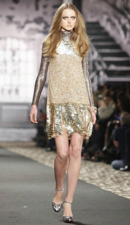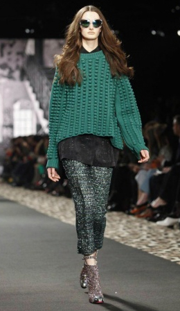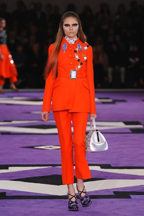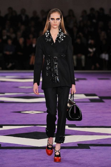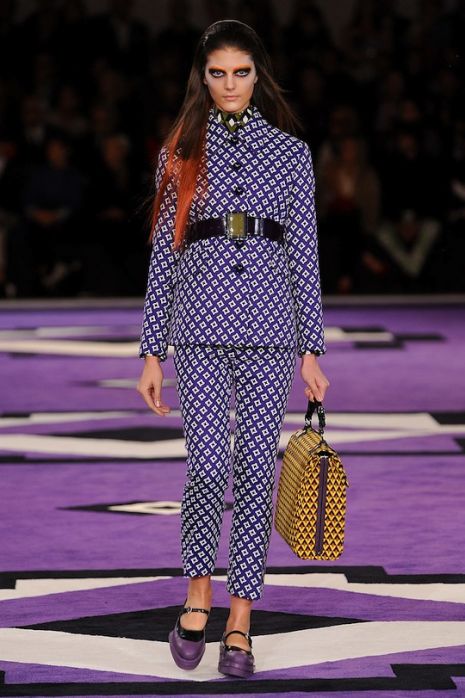Mint azt már korábban megírtuk, a Prada idei show-ját Nagylengyel büszkesége, Axente Vanessa nyitotta meg. Miuccia legújabb darabjai a hatvanas évekre emlékeztetnek bennünket; jellemzőek a hatalmas gyönyökkel és kövekkel kirakott kabátok, pantallók, geometrikus minták, a fekete, a narancs és a lila szín párosítása. Kiegészítői – táskák, platform lábbelik – változatosak és szemet gyönyörködtetőek.