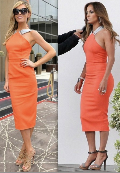 A narancssárga az idei tavasz nagy slágere! Tudja ezt Jennifer Lopez is, aki nem is olyan régen viselte ezt a gyönyörű – Victoria Beckham által tervezett – ruhát az American Idol egyik forgatásán. A ruhához az énekesnő remekül párosította a Lanvin szandált, valamint a tőle már megszokott ezüst karikafülbevalót. A modell, Abbey Clancy Dubai-ban viselte ugyanezt a ruhát, ám a ruhához egyáltalán nem illő magassarkú sokak szerint otrombává tette az egész megjelenését.