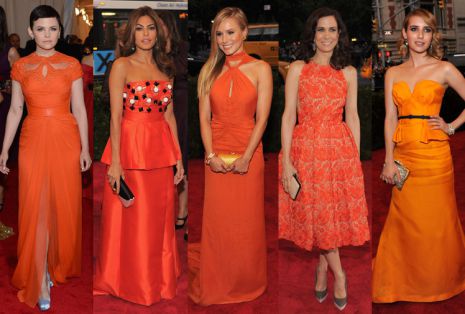 Az idei év nagy sikerszíne az arany mellett a narancs volt, hiszen több sztár is ezt a csodás tavaszi színt választotta a nagyestélyi színének, többek közt Ginnifer Goodwin, Eva Mendes, Kristen Bell, Kristen Wiig és Emma Stone is. Gin Monique Lhuillierben, Eva Pradában, Kristen Bell egy Tommy Hilfiger által tervezett ruhában, a másik Kristen Stella McCartney-ban és Emma pedig egy Christian Louboutin-csodában tündökölt a nagy eseményen.