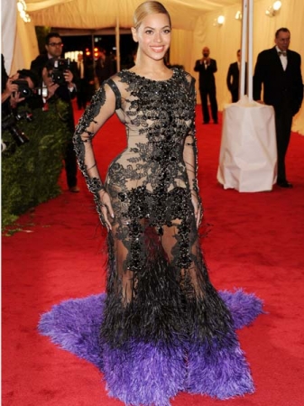 Igaz, hogy Beyoncé napjaink egyik legsikeresebb énekesnője, és a kisbabája születése után is remek formában van, de a mostani Givenchy-ruhája mellett nem lehet elmenni szó nélkül. Az átlátszó költeményen fekete csipkék takarják a sztár intimebb testrészeit, de a hab a tortán mégiscsak a színátmenetes lila tollkavalkád a ruha alsó részén.
