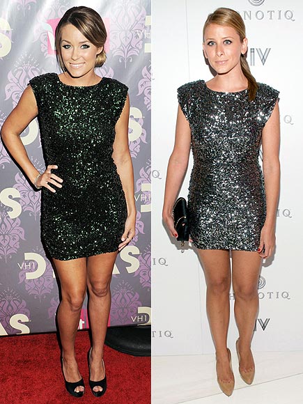 A The Hills sztárjai ugyanabban az Alicia+Olivia-ruhában jelentek meg. Az átlátszó körömlakkot s csupán egy fekete magas sarkút viselő Laurenen egyértelműen jobban mutat a ruha, míg Lo Bosworth vörös körmökkel és összhangban egyáltalán nem lévő cipőben, táskával pózol.