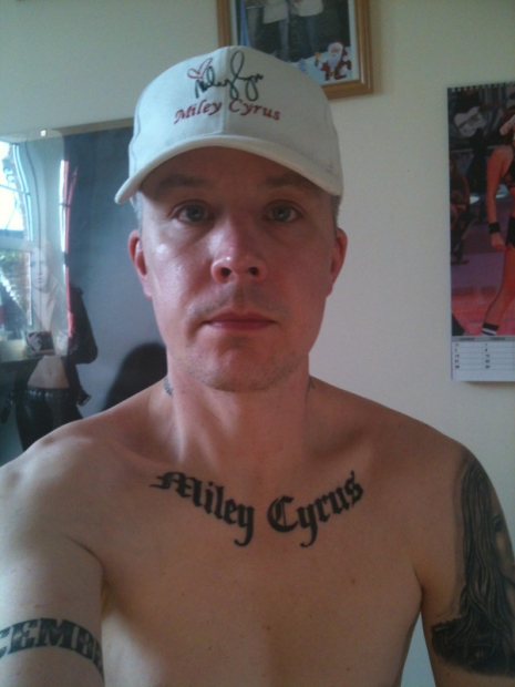 Kelet-Yorkshire-ban akad egy férfi, aki annyira megszállottan rajong a nemrég eljegyzett Miley Cyrusért, hogy 15 tetoválást is képes volt magára varratni róla. Úgy látszik, az énekesnő megtalálta legfanatikusabb rajongóját!