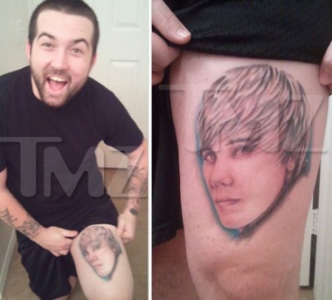 Azt gondolhatnánk, hogy Justin Bieber egyik elvetemült tinilány rajongója csináltatott magának egy tetoválást az énekes fejével a combjára, de nem. Egy erősen a húszas évei közepén járó férfi vállalta be az extrém varratást, amire egyébként még azt sem lehet mondani, hogy jól sikerült volna. Talán ezzel akarja a tinilányok szívét meghódítani, vagy simán őrült a pasas?