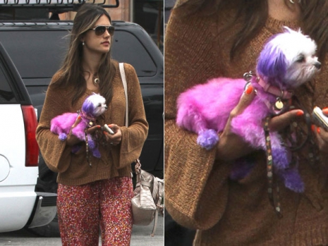 A szupermodell elnyerte a PETA nemtetszését rózsaszínű és lila kutyájával.