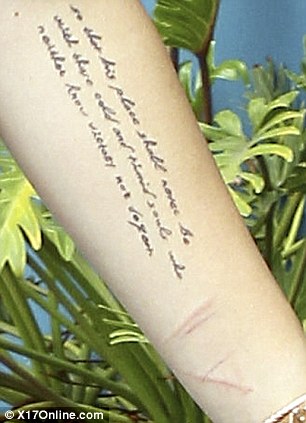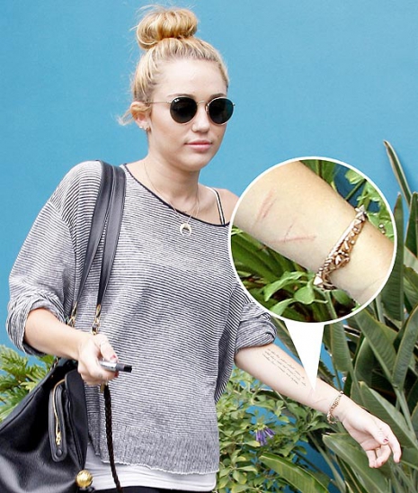 A korábbi esettel ellentétben itt már több „vonal” is látható Miley bal csuklóján, új tetkója alatt, ami nagy valószínűséggel tényleg szándékos vágásokra utal.