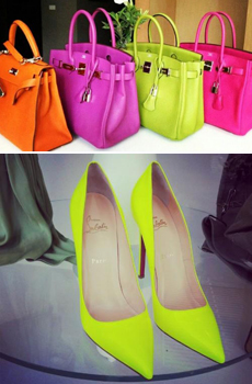 Vegyük például a világ legdrágább és legkeresettebb táskáit: Hermés is piacra dobott egy neon színekben pompázó kollekciót. Hasonlóképp járt el Jimmy Choo is, akinek lábbelijei és aprócska retiküljei szintén felhívják a figyelmet viselőjükre, akárcsak Louboutin vagy Prada páratlan topánkái.