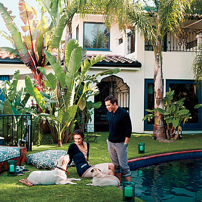 A ház ékessége mégiscsak a gyönyörű udvar, s a villát körülölelő medence. Fontos megemlíteni, hogy a pár itt is a környezettudatosságra figyelt: rengeteg pálmát és bokrot ültettek, ám műfüvet alkalmaztak, ugyanis azt nem kell locsolni, ezzel áramot és vizet megspórolva.