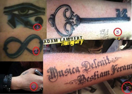 A fenti összesítő képen látszanak az eddigi tetoválásai sorban. Az első hóruszszemét még az American Idol alatt varratta magára, abból a célból, hogy mindig kísérje őt figyelemmel és védje a bajtól. A másodikat a tehetségkutató után, jelképezve a zene iránti örök elkötelezettségét. A harmadik, amely az első kettő felett helyezkedik el: nem tulajdonít neki jelentőséget, a házában van egy hasonló festmény és megtetszett neki a minta. A negyedik, az OOFTA-felirat egy közös szerzemény a párjával, közvetlenül a finnországi balhéjuk után választották ezt az amerikai szlenget, figyelmeztetésül.