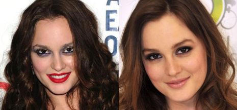 A Gossip Girl Blair Waldorfjának bájos arca sokkal jobban fest a második képen látható egyszerű sminkben, mint egy olyan extravagáns kinézettel, amit az elsőn láthatunk. A 26 éves Leighton Meester legalább 5 évvel idősebbnek néz ki a lila szemfestékkel és a tűzpiros rúzzsal.