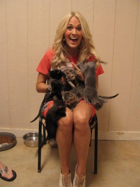 Carrie Underwood imádja az állatokat és ezt nem is titkolja, hiszen néhány napja az oklahomai Checotah Állatmenhelyen tett látogatást, melyet a Twitteren is örömmel tudatott rajongóival. Imádnivaló kiscicákkal az ölében játszott a huszonkilenc éves dalospacsirta, amit meg is örökítettek és a kép természetesen a mikroblogon landolt.
