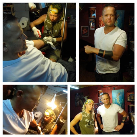 „tegnap rendesen betintáztam... Igazából a pánt a karomon mindvégig egy félkész munka volt, mert a villába költözés előtt nem volt időm a másik feléhez. Ez került most fel. Igy mostmár egésznek érzem.. Nincs jelentése ne is kérdezd. Egyszerűen sok évnyi agyalás során jöttem rá hogy nekem nem kell hogy szimbolum legyen vagy szépen kivitelezett grafika. Nekem ez tetszik a minimál és az extrém hatása miatt. És távolról is pont annak látszik aminek közelről is.. Két telibeQrt pánt. Kb. 135ezer tűszúrás. NYOMSZ EGY LÁJKOT? kösz” – írta VV Attila a Facebookon