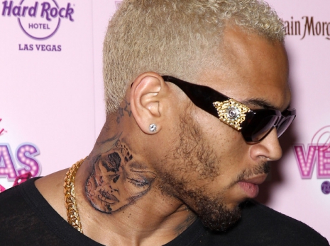 A hónap elején Chris Brown bemutatta az új tetkóját egy rendezvényen Las Vegasban. A rapper nyakán látható nagyméretű fekete-fehár ábra egy női fejet ábrázol, aminek arcfelépítése, ívelt szemöldöke és telt ajka feltűnően hasonlít Brown egykori szétvert fejű barátnőjére, hiszen hegeket és bántalmazásnyomokat is felfedezhetünk rajta.