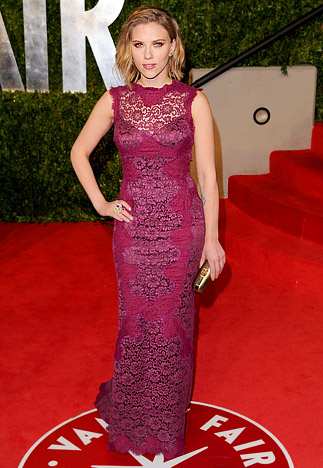 A márka teste-arca miben másban tündökölhetne a Vanity Fair Oscar-partiján, mint Dolce & Gabbanában? A padlizsán színű csipkeruha szorosan körbeöleli Scarlett alakját, aki csodálatosan néz ki.