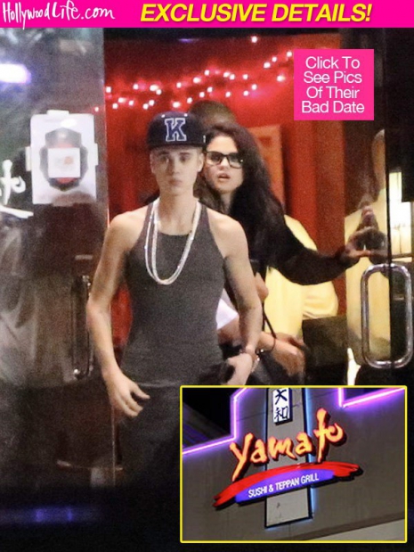 Justin randevúra vitte Selenát egy japán étterembe, azonban nem ment minden zökkenőmentesen. Szemtanúk szerint tíz perccel a megérkezésük után a lány felállt az asztaltól eléggé feldúlt állapotban, ezzel faképnél hagyva az énekest. Persze Justin azonnal barátnője után indult, de így sem kapott esélyt, mivel Selena elhajtott kocsijával. Utána a lány lakásánál próbálkozott egy órán keresztül, de nem engedték be az ajtón.