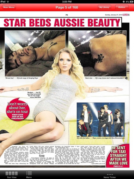 Viszont úgy tűnik, a kapcsolatuk mégsem elég erős, hogy megbirkózzon a távolsággal és Zayn biológiai szükségleteivel. Egy ausztrál pincérnő állítja, hogy elcsábította a szívtiprót, mikor a zenekar tagjai legutoljára a szigetországban tartózkodtak. Állítását egy hangfelvétellel és két fényképpel is bizonyítani tudja, amiket az ominózus estén készített.