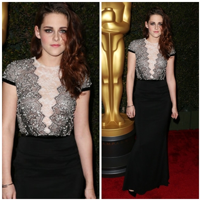 Biztos, hogy első pillantásra nem a ruha eleganciájára figyelnek fel, hanem Stewart kisasszony csodás testére. A jobbra fésült loknik tökéletesen hangsúlyozzák az arcát. A csipkés motívumok itt is megjelennek, az átlátszó szoknyarész miatt kissé még merész választásnak is bizonyul ez a Zuhair Murad-tervezte ruhaköltemény. Elképzelhető, hogy ezt a darabot nem mindenki venné fel.