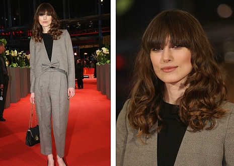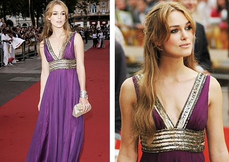 Keira egy földig érő, lila ruhát választott a Büszkeség és balítélet londoni premierjére, aranyszínű szegélye és derékrésze miatt hasonló színű táskát és ékszereket választott. Lágyan leomló hajzuhataga koronázza az egészet, egyszerűen meseszép!