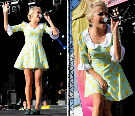 Olyan, mintha az énekesnőt a nagymamája öltöztette volna fel. Nem értjük, miért esett a választása erre a Coco Fennell-ruhára. Mi úgy tudtuk, hogy ezek már réges-régen kimentek a divatból...