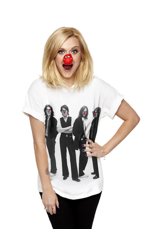 Az angol műsorvezetőnő szőke hajjal, pirosba borulva, Marilyn Monroe-s pólóban bolondozott a kamera előtt, és természetesen az elmaradhatatlan piros orr is ott figyel az Xtra Factor háziasszonyának arcán.