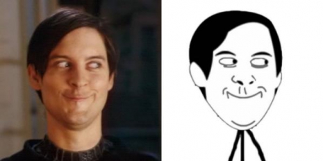 A Pókemberrel világsikert arató Tobey-t is beállították a mémek táborába, ebben a sejtelmesen, csibészesen néző jelenetében kapták le, amit később mindenféle kétértelmű poszthoz felhasználtak a humorgyárosok.