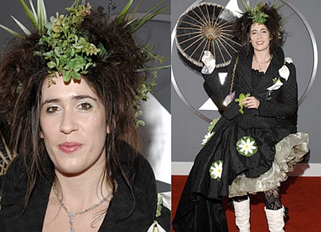 Az angol énekes-zeneszerzőtől nem állnak messze az extrém ruhák, kedvenc kiegészítője a napernyő, de ez a békákkal és tavirózsákkal díszített dressz egyszerűen förtelmes, nem is beszélve a hajában található dzsungelről.