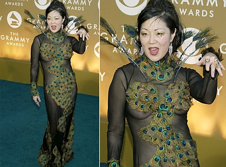 Margaret Cho a 2004-es díjátadón viselte az alábbi ruhát, amely nemcsak pávamotívumos, de valódi tollakkal díszített. Ez legyen a legkevesebb, ami miatt leszóljuk a ruhát: a 17 Again sztárja nem vett melltartót, így az összes fotón kikandikál mindkét melle!