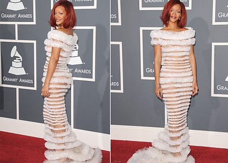 Ebben a fehér ruhában hamarabb néz ki karácsonyfának, mint világhírű énekesnőnek. A boákat idéző „díszítés” és a hálós anyag nem szimpatizálnak egymással, épphogy nem bukkan elő Riri melle.