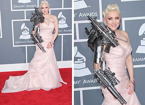 Az orosz származású amerikai énekesnő kiverte a biztosítékot a 2012-es Grammy-díj-átadón. Jobb karja teljesen mutálódott: a Terminátort idézi ezekkel a gépfegyverekkel az oldalán. A ruha gyönyörű, de a kiegészítő!
