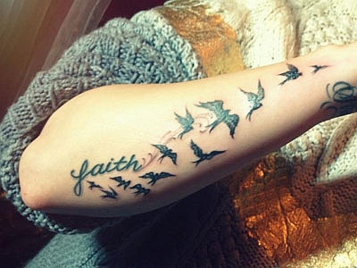 Demi sem fogta vissza magát, amikor bőrének díszítéséről volt szó, így az ő testén is többféle mintát hagyott a tinta. Legutóbbi tetoválása az eddigi legnagyobb. 12 repülő madarat ábrázol, melyek apró örvényt keltenek maguk után, valamint a faith, azaz a hit szó olvasható. Érdekesség, hogy maga a szó, már 2011 decembere óta ékesíti az énekesnő jobb alkarját, a madarak azonban csak 2012 novemberében kerültek felvarrásra. Érdemes még megemlítenünk, hogy a tetoválás a tetoválókörökben méltán híres Kat Von D keze munkáját dicséri.