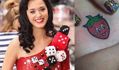 Katy köztudottan rajong az édes apróságokért, azonban nem csak ennek a szenvedélyének hódolt, amikor jobb belső bokájára varratta ezt a mosolygós eprecskét 2009 júliusában. Mielőtt tű érte volna a bőrét, a következőt csiripelte a Twitteren: „Azon gondolkodom, hogy ma este megcsináltatom a második tetoválásom. Egy rajzfilmszerű epret szeretnék, ezzel is megünnepelve az elmúlt 15 fantasztikus hónapot!” Katy ezzel a One Of The Boys című albumának sikerességére, valamint a Hello, Katy névre keresztelt turné sikerességére célzott.