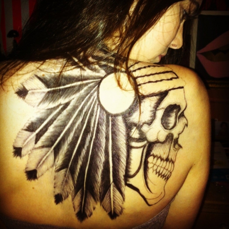 Kendall Jenner teljesen lesokkolta az internetes közösséget egy Instagramra feltöltött fotóval, melyen háta látható, amin egy hatalmas tetoválás virít. A modellként dolgozó 17 éves lány gondolt egy merészet és egy hatalmas vigyorgó koponyát varratott hátára, melyen egy tollas indián fejdísz látható.