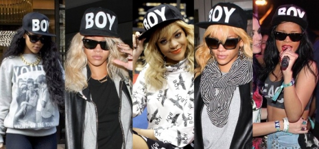 Rihanna az utóbbi időben nem éppen visszafogottságáról híres, sőt „rosszfiús stílusa” még nagyobb ellenszenvet vált ki a tinilányok anyukáiból. Azonban egyik kedvenc baseball sapkája nem az extravagánsságot hangsúlyozza, hiszen egyszerű fekete színével és a fehér Boy felirattal egyszerű mégis nagyszerű kiegészítőként praktizál a barbadosi pacsirta gardróbjának darabjaként.