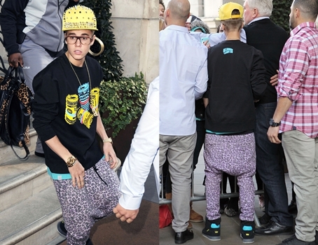 A kanadai tinisztár február 27-én jelent meg egy érdekes öltözetben, ami egy párducmintás nadrágot (ami főleg hátulról állt szörnyen rajta) és egy citromsárga szegecses baseballsapkát rejtett magában, de a gázmaszk óta ezen már szinte meg sem tudunk lepődni. A rajongók természetesen cukinak látták a szerelést, míg Perez Hilton szerint Justin úgy festett, mint a legújabb tagja az LMFAO-nak.