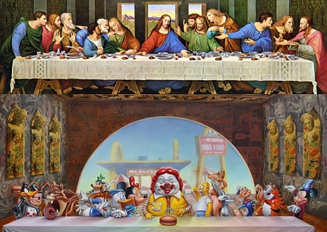 Ron English szerint az idő változásával az istenség is változik, a Szupervacsora és Az utolsó vacsora közt némi párhuzam vonható, az ő képén helyet kapnak a modern kor legnagyobb arcai: Homer Simpson, Dodó kacsa és Minnie Mouse is, de természetesen középen az amerikaiakra rendkívül jellemző szimbólum, a hamburger és a mekis bácsi foglal helyet.