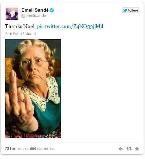 Sandé, elolvasva az interjút, rögtön válaszolt is Twitter-fiókján egy fotóval, jelezve, hogy Noel bekaphatja.